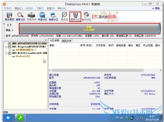6.在弹出的窗口中你会发现工具栏中的“删除分区”图标为灰色,这时先选中一个硬盘分区然后会看到“删除分区”图标变亮了然后单击它;按照这个方法依次将所有分区都删除掉,如图会发现“删除图标”会再次变灰。