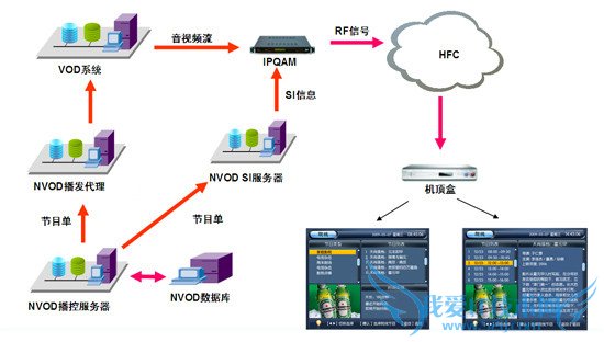 NVOD(Near video on demand),称为就近式点播电视。这种点播电视的方式是:多个视频流依次间隔一定的时间启动发送同样的内容。比如,十二个视频流每隔十分钟启动一个发送同样的两小时的电视节目。如果用户想看这个电视节目可能需要等待,但最长不会超过十分钟,他们会选择距他们最近的某个时间起点进行收看。在这种方式下,一个视频流可能为许多用户共享。
