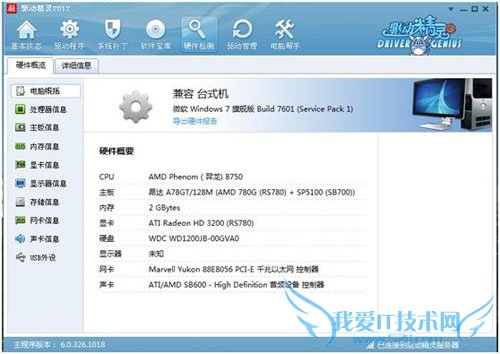 进入硬件检测模块,可以看到:硬件概括、详细信息两个个选项,配件各项规格一目了然。