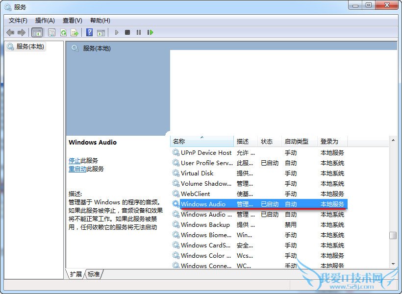 2、在弹出窗口中的右侧列表里找到“Windows Audio”服务,双击打开