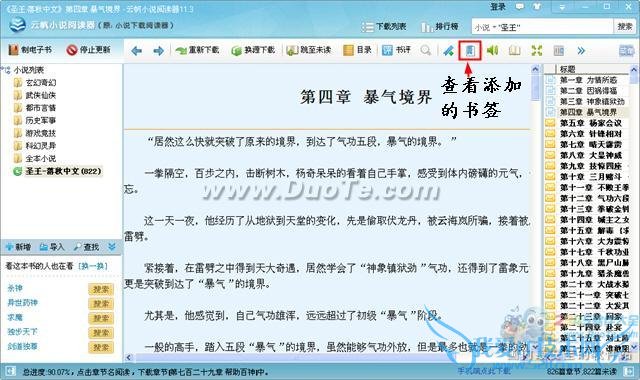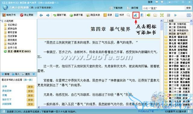 阅读器的书签功能可以让你快速找到前次阅读的地方,点击下图中的图标可以为小说添加书签。
