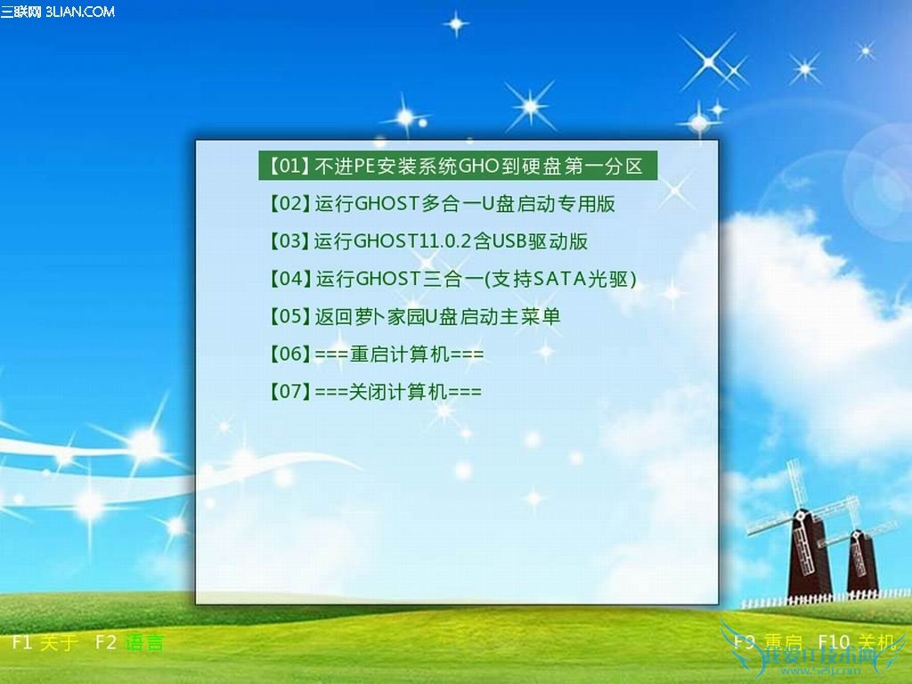插入U盘启动后点击“不进PE安装系统GHO到硬盘第一分区”即可进入安装系统状态了: