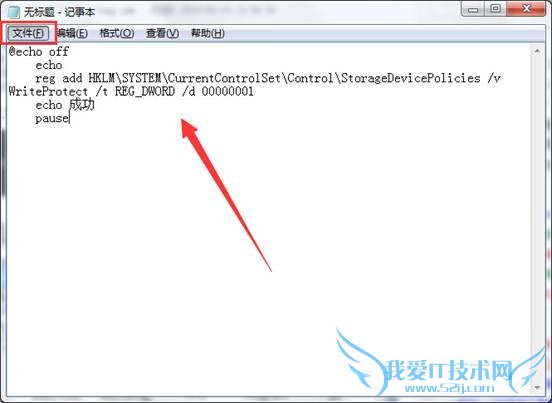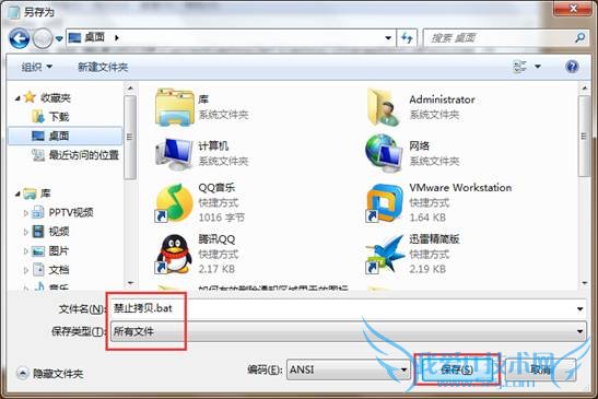 3.点击文件 – 另存为,将文件名改为“禁止拷贝.bat”然后保存类型选择为“所有文件”点击保存(S)进入下一步操作。如下图所示