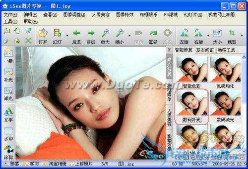 iSee打开图1.选择“右侧工具条”—照片修复—数码补光。操作简单,点击一下“数码补光”,图片就会明亮起来。