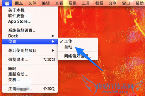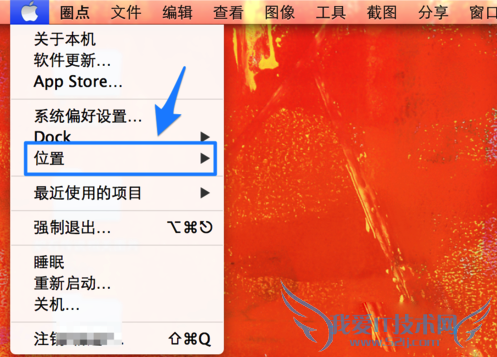 1、接下来请点击屏幕顶部系统菜单栏中的苹果标志,在弹出的菜单中可以看到一个“位置”选项,如图所示