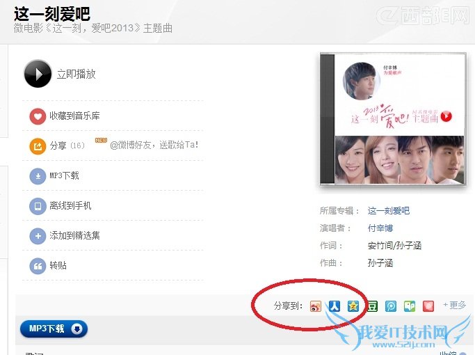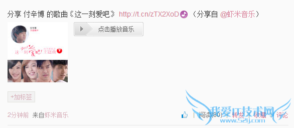 比如使用虾米网站,在网站找到歌曲“这一刻爱吧”,进入播放页面,点击微博分享。这样就能在新浪微博发音乐了!