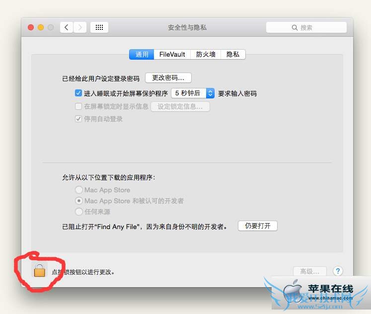 在苹果菜单中打开系统预置,点击安全性与隐私。点击界面左下方的“点按锁按钮以进行更改”。