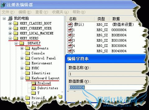 ②开始→运行→输入regedit,打开注册表编辑器,找到HKEY_USERS.DEFAULTKeyboard LayoutPreload项并选中,在右边的窗口中即可看到输入法的排序1、2、3、4...,通过修改这些1、2、3、4...的键值即可完成输入法的排序问题,输入法的键值就是在①中找到的每个输入法对应的名称,相关截图如下所示: