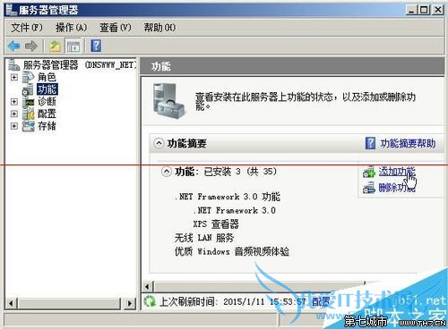 5、打开“服务器管理器”后,左边单击“功能”,再右键找到“添加功能”,单击它;