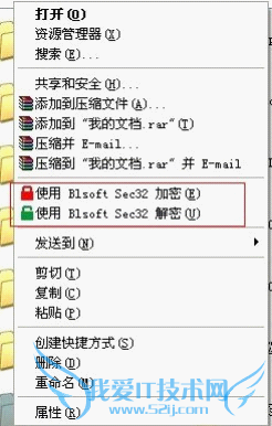 解密过程是加密的一个逆向过程,操作类似。BlsoftSec32也支持右键加密和解密,右键选择需要加密解密的文件,如图(7)所示: