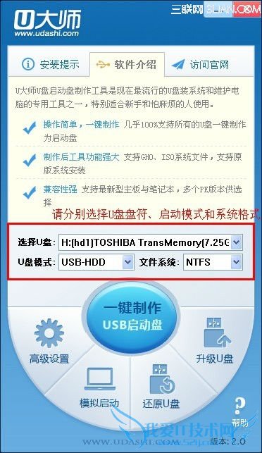 2.该工具能够自动识别出插入电脑USB接口的所有USB设备,请选择要制作成启动U盘的盘符,然后可以根据个人情况,分别设置启动模式和系统格式,如图: