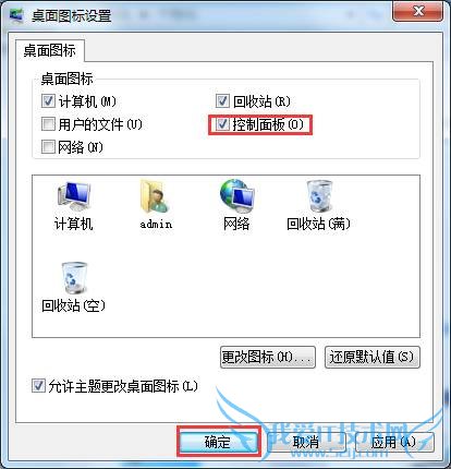 三、然后在弹出的桌面图标设置窗口中,勾选“控制面板”点击“确定”即可。如下图所示: