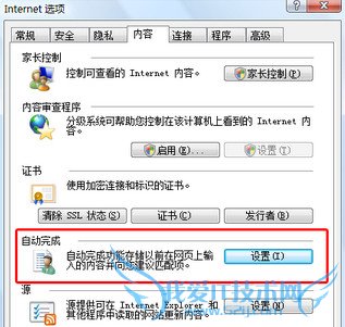 在“Internet选项”中选择“内容”标签,在“自动完成”栏点击“设置”