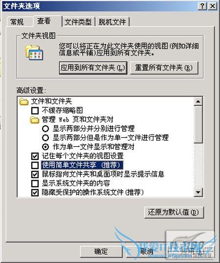 打开“我的电脑”,在“工具”菜单中打开“文件夹选项”菜单,在“查看”选项中,关闭“使用简单文件共享”功能。再次点击“我的电脑”中的磁盘分区或文件夹,启用文件共享之后,我们可以发现文件共享功能多了一些选项,增加了权限和用户数限制等功能。
