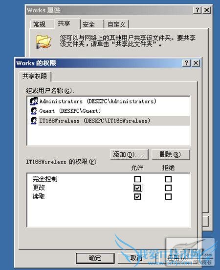 即便是超级用户,也可以设置其权限。例如,我们共享“学习资料”这个文件夹,设置为Guest用户可以读取,设置IT168Wireless用户可以更改和读取,而超级用户Administrator设置为完全控制。首先删除everyone用户组,再一一设置每个用户的具体权限。