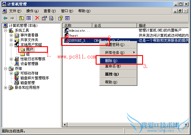 第2步:单击左侧 计算机管理>系统工具>本地用户和组>用户,在右侧找到自己需要删除的用户,选中右键选择删除即可。