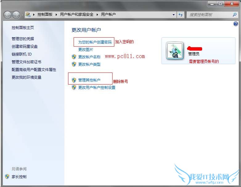 只要是Windows系统都可以直接在计算机管理中直接去计算机用户进行删除操作,当然也可以在控制面板>用户帐户和家庭安全>用户帐户。这里进行系统帐户的一些删除操作。