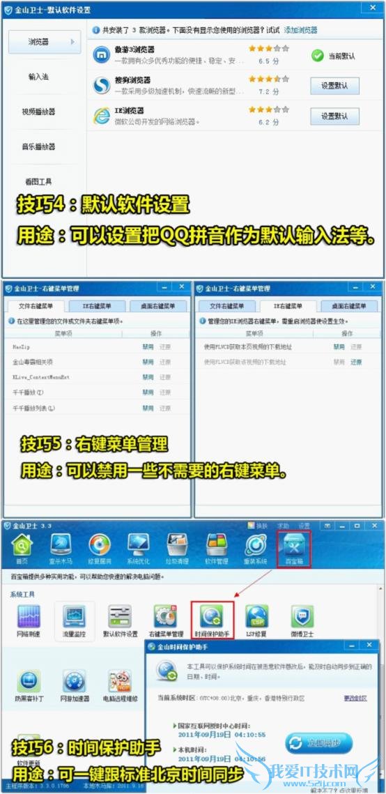 图3 默认软件设置、右键菜单管理、时间保护助手