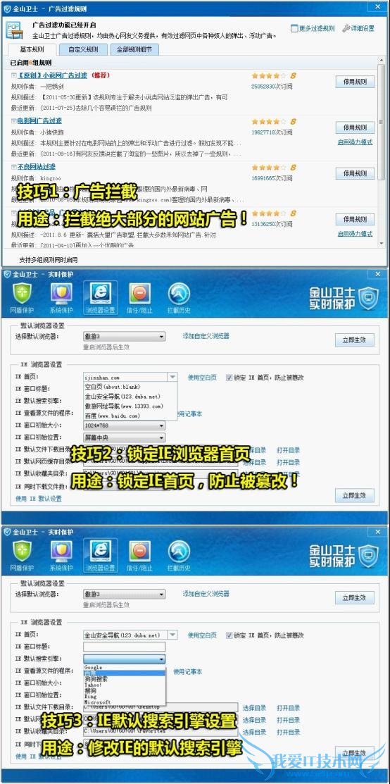 图2 广告拦截、IE首页锁定、IE搜索引擎设置