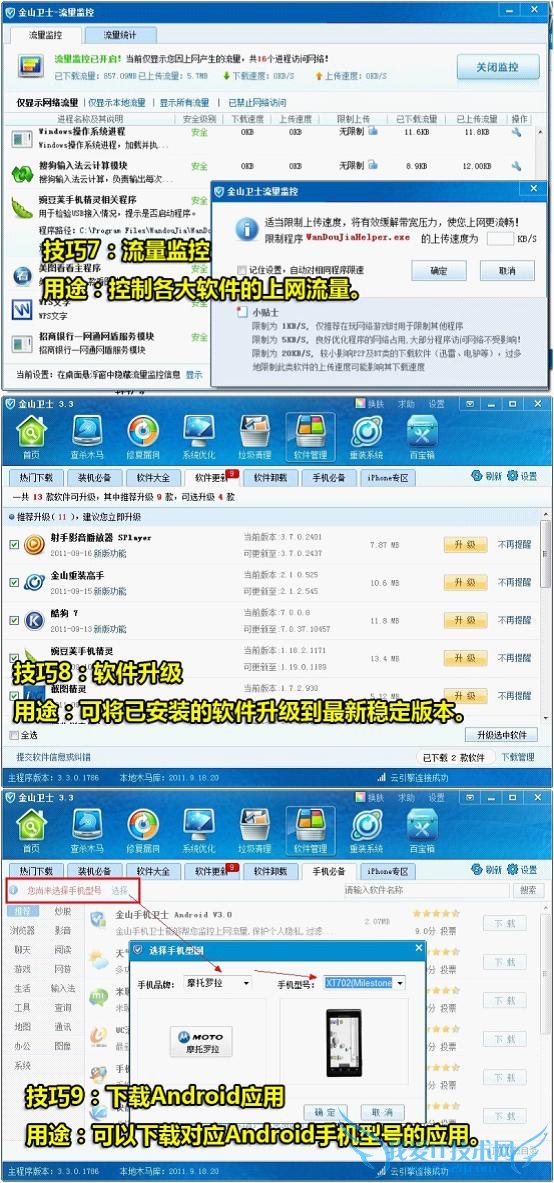 用途:金山卫士不但能下载和升级电脑软件,还能下载Android智能手机应用软件。