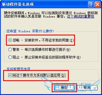 3.接着我们将“系统管理员选项”中的“将这个操作作为系统默认值应用”前面框框勾选,然后在“您希望Windows采取什么操作?”选择为“忽略-安装软件,不用征求我的同意”然后点击“确定”按钮即可;如下图所示: