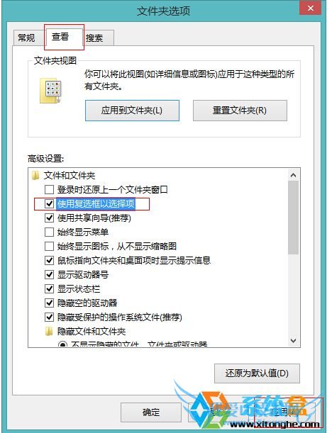 2、打开“文件夹选项”,然后点击“查看”切换到查看页面,将“使用复选框以选择项”取消选择并确定即可消除文件夹复选功能,反之即开启。