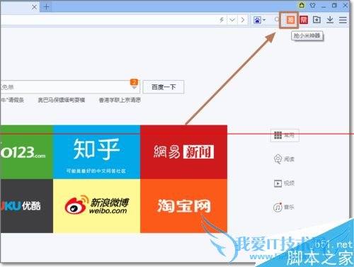 1、首先下载安装百度浏览器,打开百度浏览器,在右上角集成了抢小米、抢火车票的功能插件。