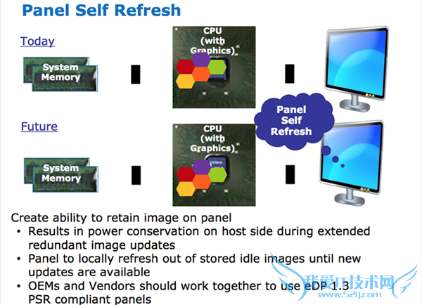 PSR屏幕自刷新技术的全称为Panel Self Refresh的简写,这项技术最初是由Inter在2011年秋季在英特尔信息技术峰会上首次与世人见面的。在当时,PSR屏幕自刷新技术被视为能够有效降低PC平台功耗的技术而普遍被业界看好。而且由于在PSR技术下,屏幕面板并不需要持续的刷新,笔记本的电池续航时间可以额外延长40分钟左右的时间。