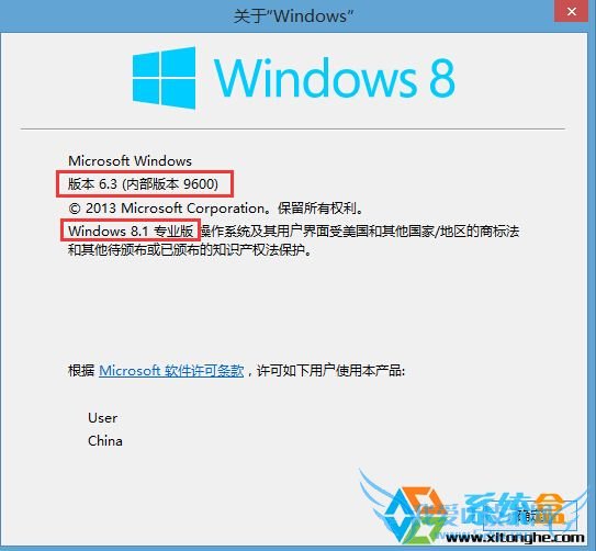 2、这时会打开一个“关于 windows”的小窗口,我们可以在其中查看到当前Win8系统的版本,还有内部版本号,由下面的图我们可以看出,当前系统为 Windows8.1 www.xitonghe.com 版本 内部版本号为 9600 ;
