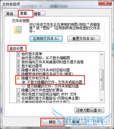 接下来出现下面的这个页面,此时用户需要用鼠标单击选择‘查看’这一项。进入到这一项以后,用户需要找到高级设置的地方,然后在这个里面找到隐藏文件的选项,展开这一项之后,会有两个选择,一个是不显示隐藏的文件,另一个则是显示,此时用户将不显示的这一项用鼠标单击勾选中即可。