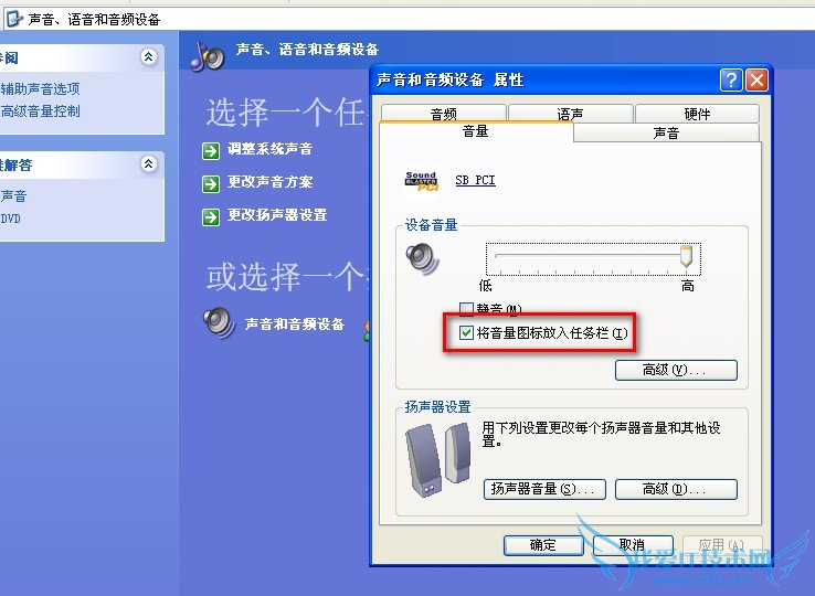 控制面板——声音、语音和音频设备-声音和音频设备-勾选将音量图标放入任务栏;