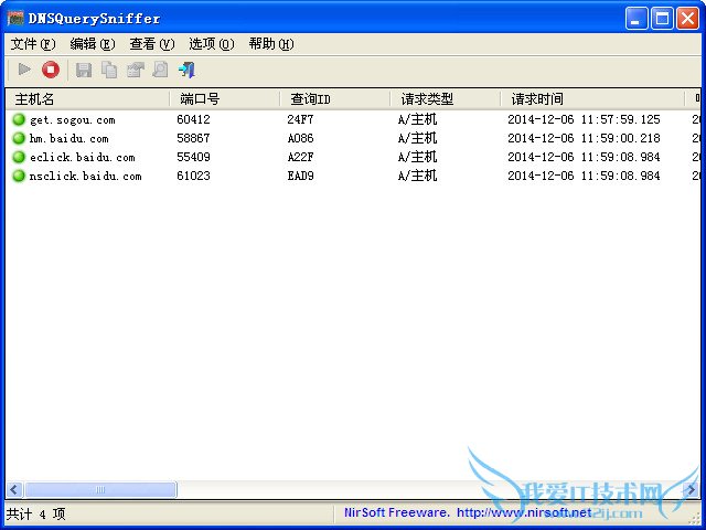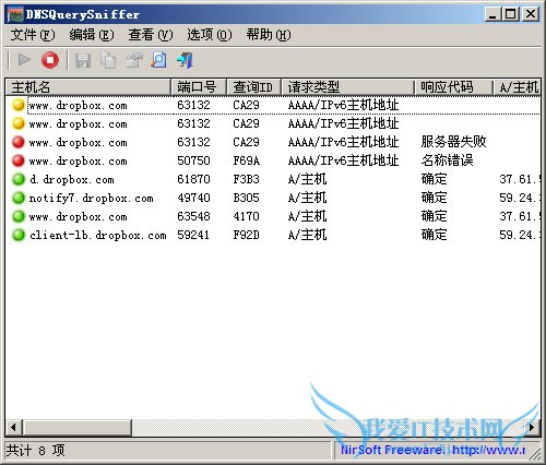 我使用的是一个名为DNSQuerySniffer的嗅探工具,该工具能够实时显示本地电脑的DNS查询记录,对于每一个DNS解析查询,显示以下信息:主机名,端口号,查询ID,请求类型,请求响应时间,响应代码等记录,并返回的DNS记录的内容。域名添加到Hosts文件中,DNSQuerySniffer就不会再检测到该域名的解析,然后继续运行Sniffer嗅探器和应用软件,一个一个找出所有的无效域名,然后手动将每个域名都添加到Hosts文件即可。