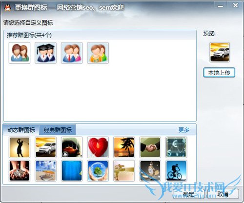 步骤二、之后会打开更换群图标的窗口,上面有系统默认推荐的4个图标,提供用户使用。当然还可以在下面的“动态群图标和经典群图标”上选择自己喜欢的图标。如图所示: