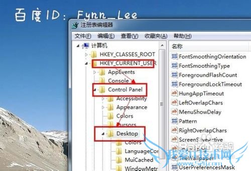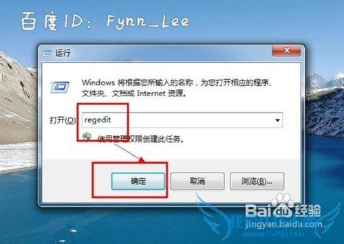 打开后,在文本框中输入“regedit”,然后点击“确定”按钮打开注册表编辑器并定位到HKCY_CURRENT_USERControl PanelDesktop节点。