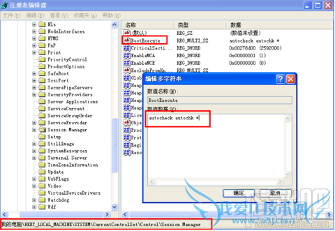 依次展开“HKEY_LOCAL_MACHINE ”→“SYSTEM ”→“CurrentControlSet ”→“Control ”→“SessionManager ”,在右侧找到BootExecute项,双击将其值设置为“ autocheck autochk *”。 经过这样设置以后,如果电脑出现蓝屏,将会在电脑重启后自动运行自检程序,试图对系统中存在的错误进行修复。