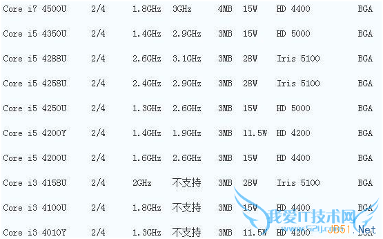 新的Haswell处理器在性能上相比上一代IVB处理器,性能上有进一步的提升,并且呈现出高端产品性能化低端产品低功耗化的发展趋势。不过最为引人注目的新升级则是来自Iris(锐炬)核心显卡,相比较上一代平台集成的核心显卡,实际测试中Iris(锐炬)和Iris Pro(锐炬Pro)核显的性能确实提高明显,这个提高的程度甚至是成倍的。不过与IVB平台不同,并不是所有的Haswell处理器都搭载同样的核显,根据产品定位的高低,也分多种型号,消费者在购买的时候也要格外注意。在这里笔者直接给一张表格以供大家参考。