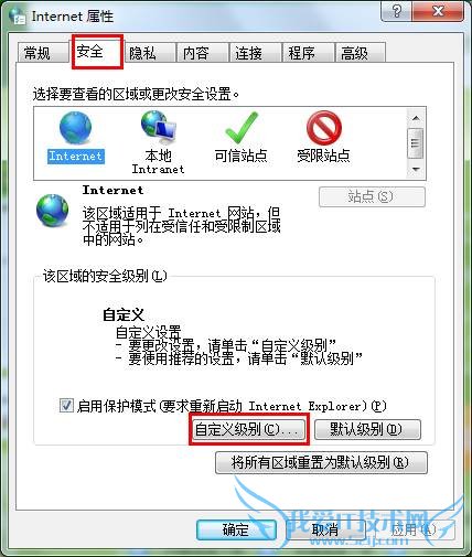 2.切换到“安全”选项卡,点击“自定义级别”,如下图所示