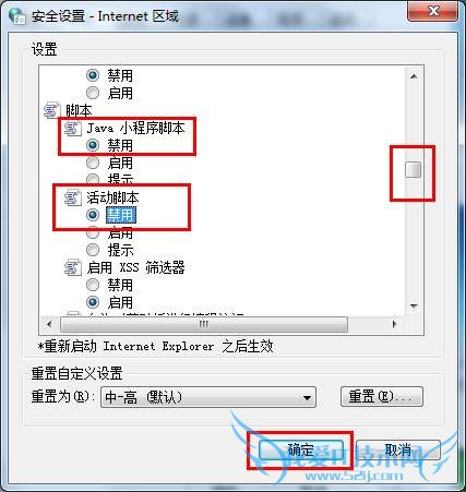 3.将滚动条下拉,将“java小程序脚本”和“活动脚本”勾选为“禁用”,点击“确定”按钮保存退出,如下图所示。