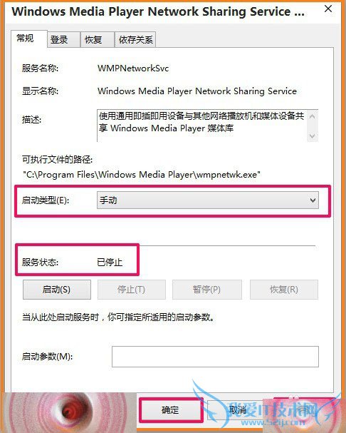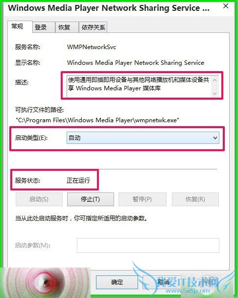 5、在打开的对话框中,我们可以看到Windows Media Player Network Sharing Service的启动类型为:自动,服务状态为:正在运行;