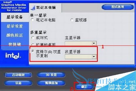 4、选择“英特尔(R)双显示复制”,就可以实现两个显示设备同时显示,之后也可以在右侧的下拉菜单中调整“主显示器”和“次显示器”,最后单击“确定”即可。