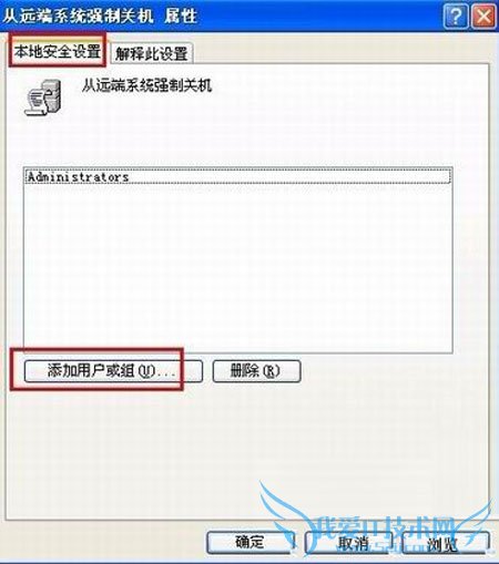 进入“属性”界面,在“本地安全设置”中单击“添加用户和组”。