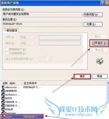在选择用户和组对话框,单击“高级”-“立即查找”,选择“Guest”,一路单击“确定”。