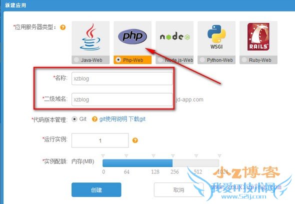 四、接下来切换到应用引擎>>新建应用>>选择PHP应用并输入名称和二级域名>>然后点击创建。