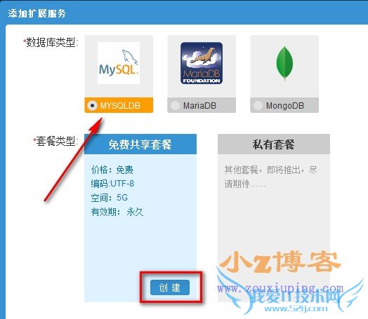 三、开通成功后,进如控制台。点击云数据库>>新建数据库>>选择数据库类型(WordPress是Mysql数据库),然后点击创建按钮