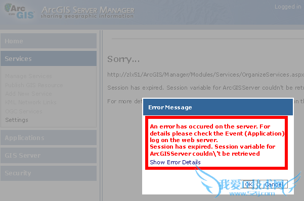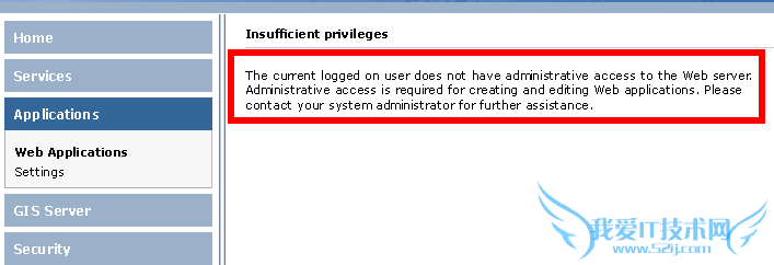添加自己的管理员账户、arcgissom到agsadmin组中;添加管理员账户、arcgissom、arcgiswebservices到agsusers组中; 再次使用arcgissom登录,发现能够成功了! 3.使用arcgis server manager,创建web application,发现以下问题——“Insufficient privilege,the current logged on user does not have administrative access to the web server.”如下图: