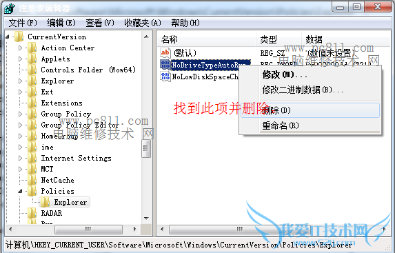 第2步:在打开的注册编辑器中依次单击找到并点击打开“HKEY_CURRENT_USERSoftwareMicrosoftWindowsCurrentVersionPoliciesExplorer”,并在右侧找到NoDriveTypeAutoRun此项,在此项上右键删除。