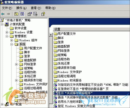 点击“开始”菜单→“运行”,在弹出的对话框中输入“gpedit.msc”打开组策略编辑器。在“计算机配置”中找到“管理模板→系统”,然后在右窗格中双击“显示‘关闭事件跟踪程序‘”选项(如图2所示),将弹出的窗口属性设置为“已禁用”,再点击“确定”按钮即可。看看,是不是熟悉的Windows关机程序又出来了。
