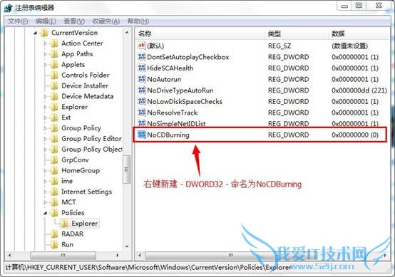 3.在右边界面空白处,右键新建 – DWORD32 命名为NoCDBurning。如下图所示