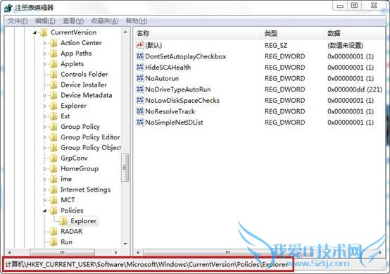 2.在打开的注册表编辑器中找到HKEY_CURRENT_USERSoftwareMicrosoftWindowsCurrentVersionPoliciesExplorer键值。如下图所示