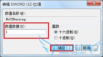 4.双击打开新建的NoCDBurning,修改键值为1,点击确定完成操作。如下图所示